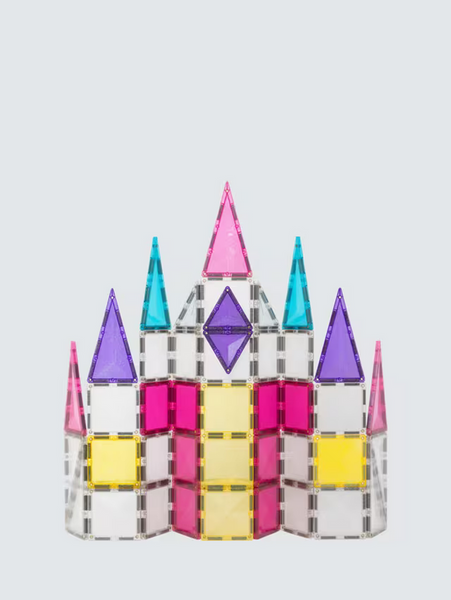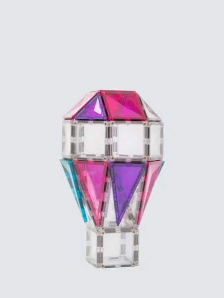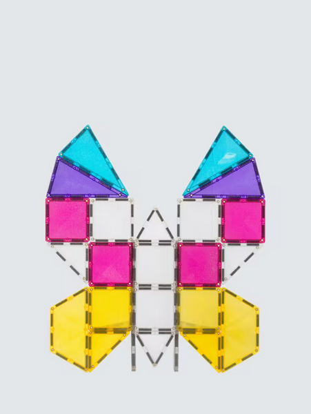 Includes 56 glitter magnetic tiles in dazzling colors of pink, yellow, teal, and purple.