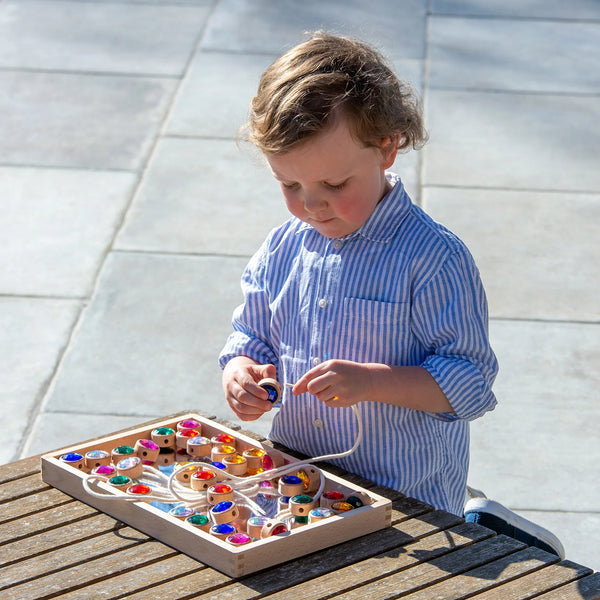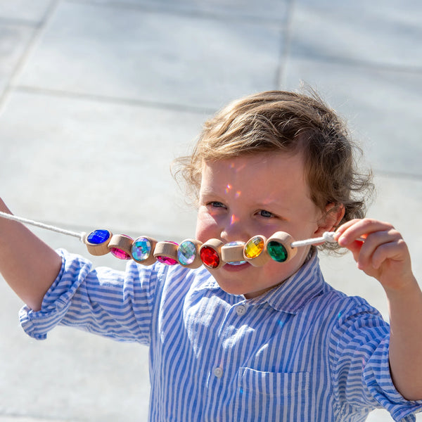 Introduce your child to a world of colour and creativity with these brightly coloured acrylic jewels, beautifully framed in smooth and chunky FSC®-certified beechwood surrounds. Each jewel is double-sided with a polished, faceted finish, designed to catch the light and showcase vibrant, shiny colours. A central threading hole in each wooden frame allows the jewels to be strung together in patterns or sequences, encouraging endless creative possibilities.